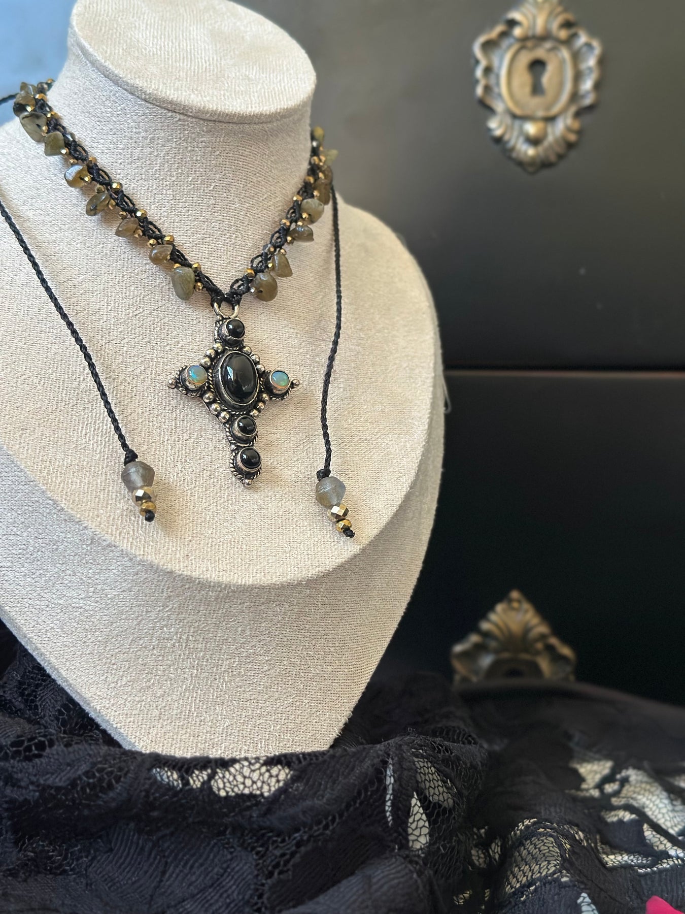 Onyx and Opal Cross Macrame Choker with Labradorite