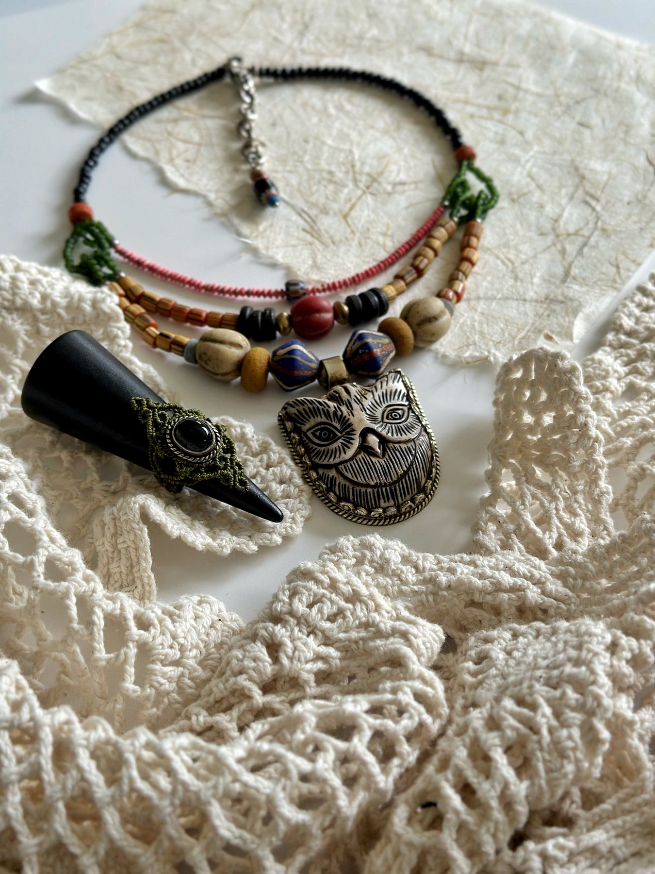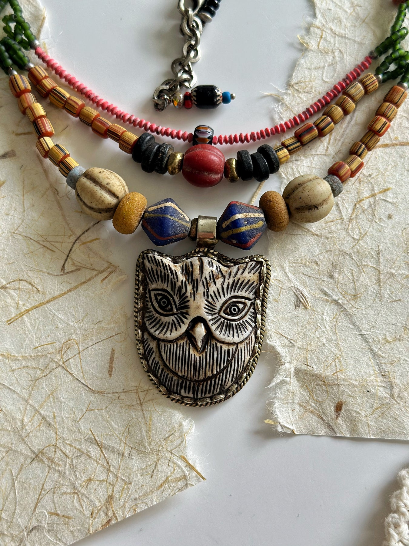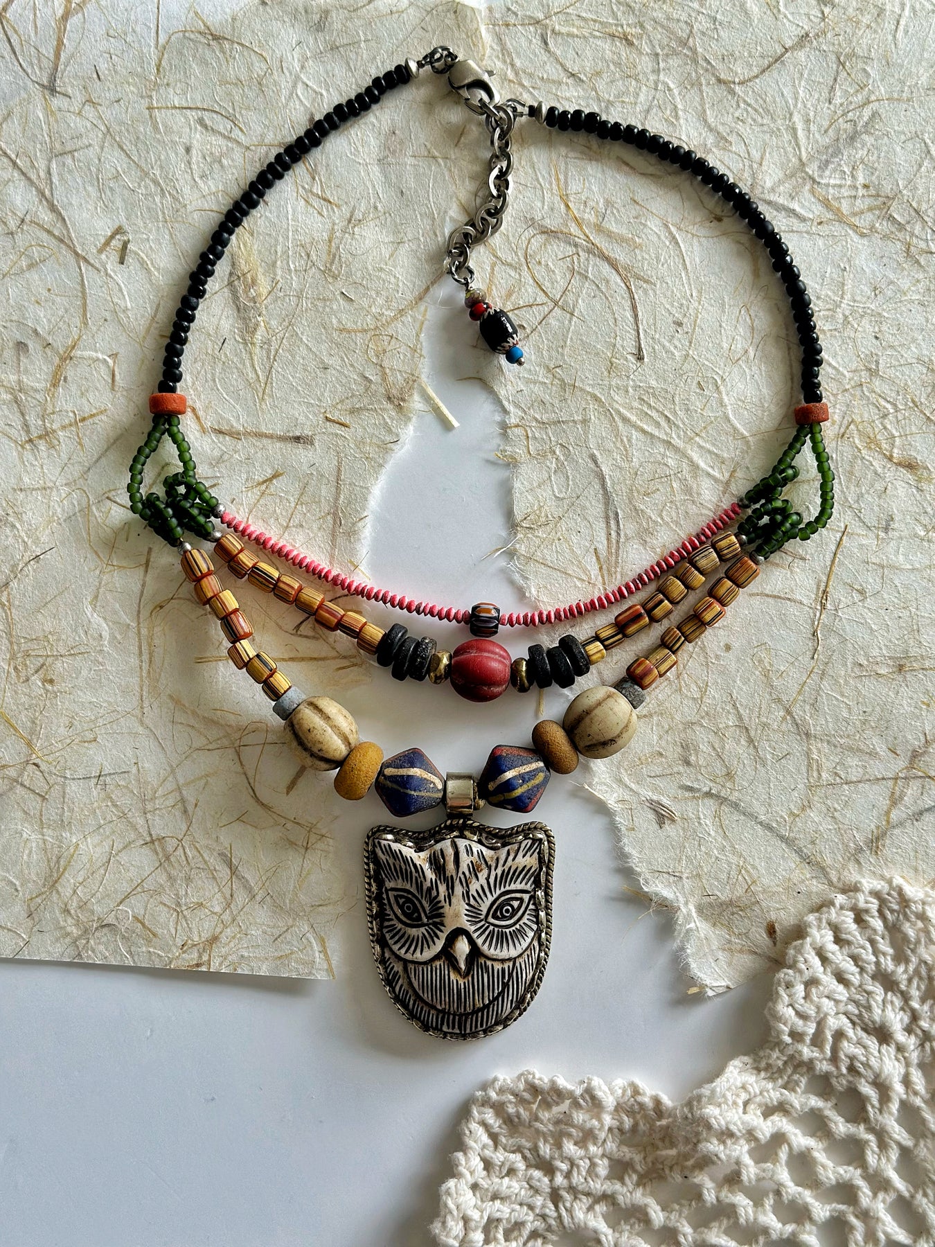 Buffalo bone owl pendant, Tibetan silver, seed beads, Czech glass beads, Indonesian beads, vintage beads, beacon glass beads from Thailand, Venetian bead, java beads