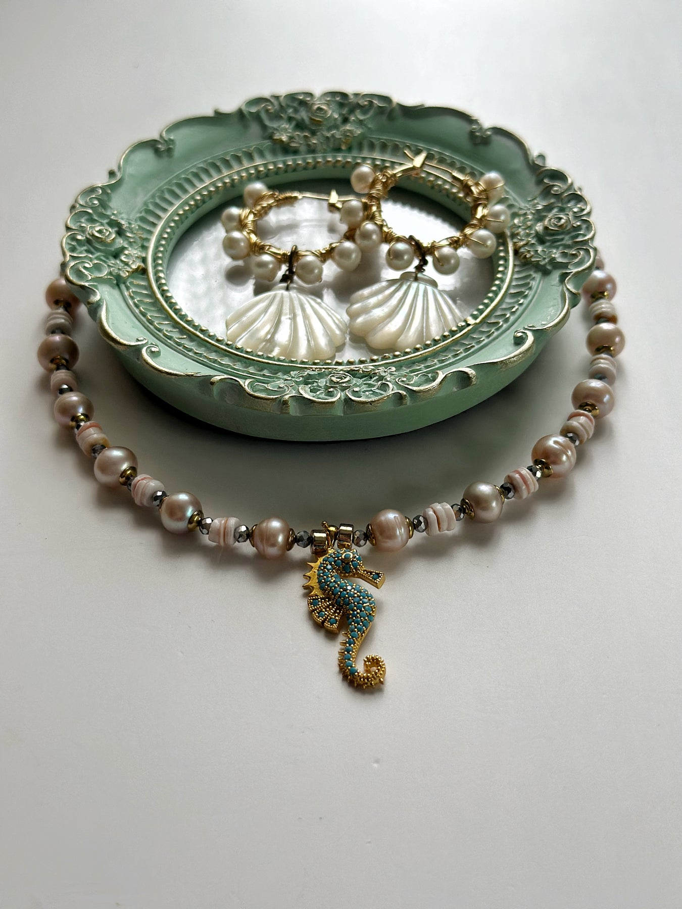 Pearl and Shell Seahorse Earring and Necklace Set